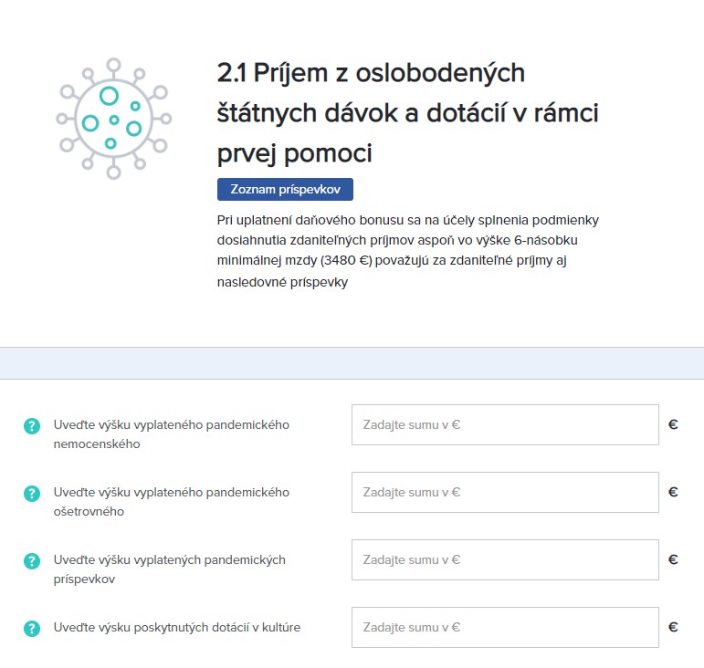 S použitím našej aplikácie si tak jednotlivé pandemické príspevky uvediete za účelom získania daňového bonusu na dieťa jednoducho a bez zbytočných komplikácií. Ich výšku napíšete priamo v kroku, kde zadávate svoje príjmy a algoritmus sa postará o to, aby sa do daňového priznania preniesla na správne miesto. Jednoducho a online.