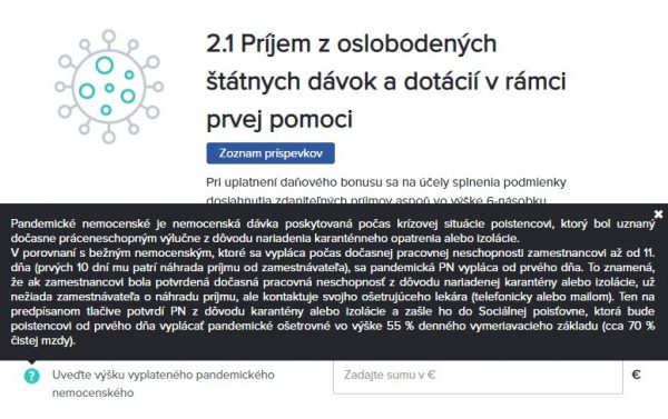 S použitím našej aplikácie si tak jednotlivé pandemické príspevky uvediete za účelom získania daňového bonusu na dieťa jednoducho a bez zbytočných komplikácií. Ich výšku napíšete priamo v kroku, kde zadávate svoje príjmy a algoritmus sa postará o to, aby sa do daňového priznania preniesla na správne miesto. Jednoducho a online.